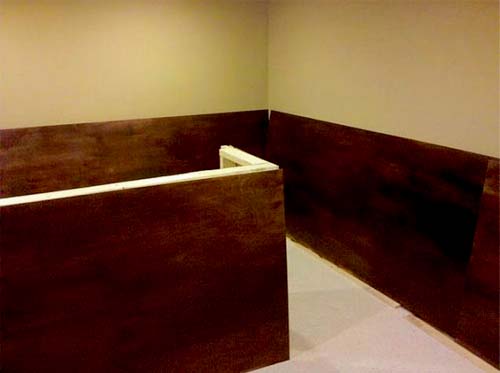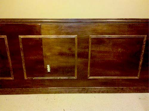 Чтобы придать интерьеру респектабельности, имитируем дорогие панели вайнскот. Для этого закрепляем на фанере квадратные рамы из деревянных профильных реек, низ панелей оформляем высоким деревянным плинтусом, верх настенных панелей также закрываем профильной рейкой. Все элементы предварительно тонированные.