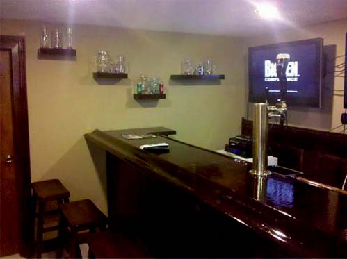 Итак, в основу легла идея оборудовать спорт — бар в небольшом подвальном помещении. Центральным элементом интерьера, разумеется, станет барная стойка, своими руками возведенная из досок и фанеры. Дополним ее высокими стульями, большими телевизорами и спортивной атрибутикой на стенах – и стильный интерьер готов.