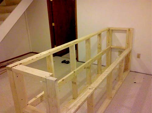 - Для начала нужно сделать основу из брусьев. Их высота должна быть от 105 до 110 мм. Длина подбирается ориентируясь на размер кухни.
