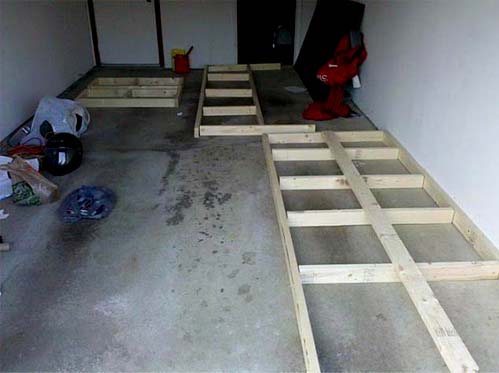 Каркас выполнили из досок на гвоздях. Две плоские решетки соединили межу собой и жестко закрепили к стене и полу. Самое сложное на данном этапе — выдержать верхние грани каркаса в горизонтальной плоскости. В нашем случае в помещении изначально был тщательно выровнен пол, поэтому задача сводилась к созданию ровных прямоугольных рамок. В противной ситуации, думаю, пришлось бы выполнять конструкции по месту.