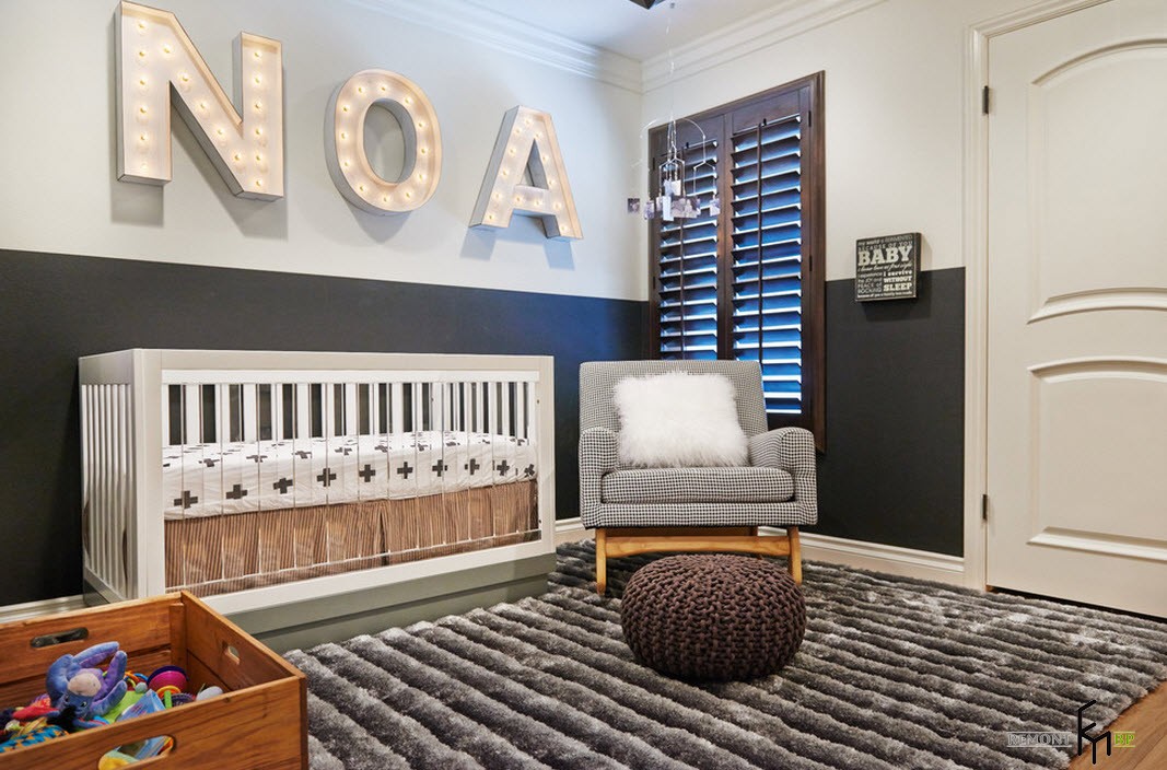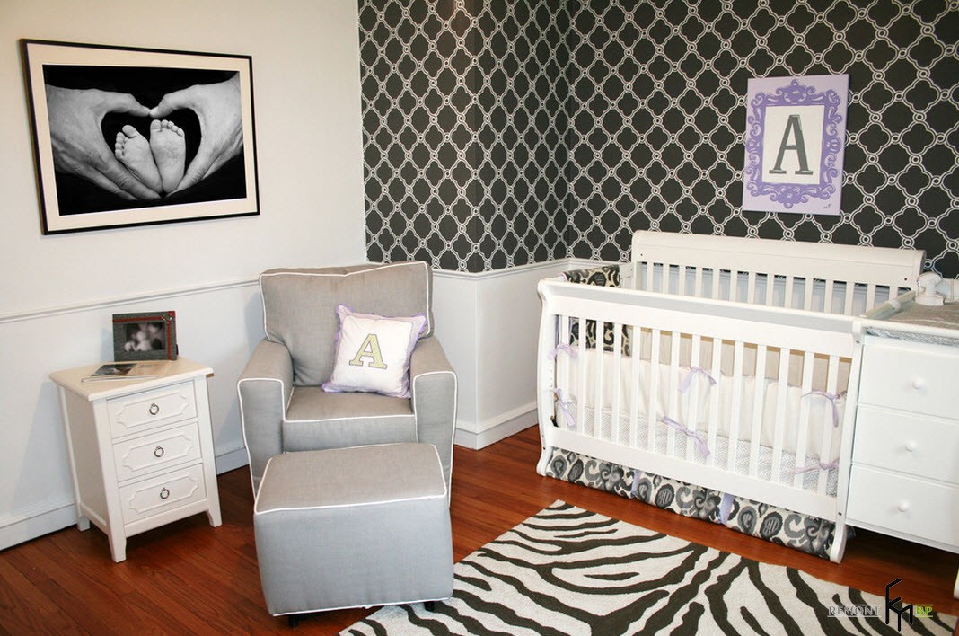 Детская для новорождённого. Элегантность комнаты, несомненно, отразится на формировании безупречного вкуса маленького человечка. Персонализация достигается с помощью монограммы по имени ребёнка, художественных фотографий на стене и столике. Напольное покрытие из натурального дерева разрушает монотонность серых оттенков и делает интерьер комнаты тёплым и мягким.