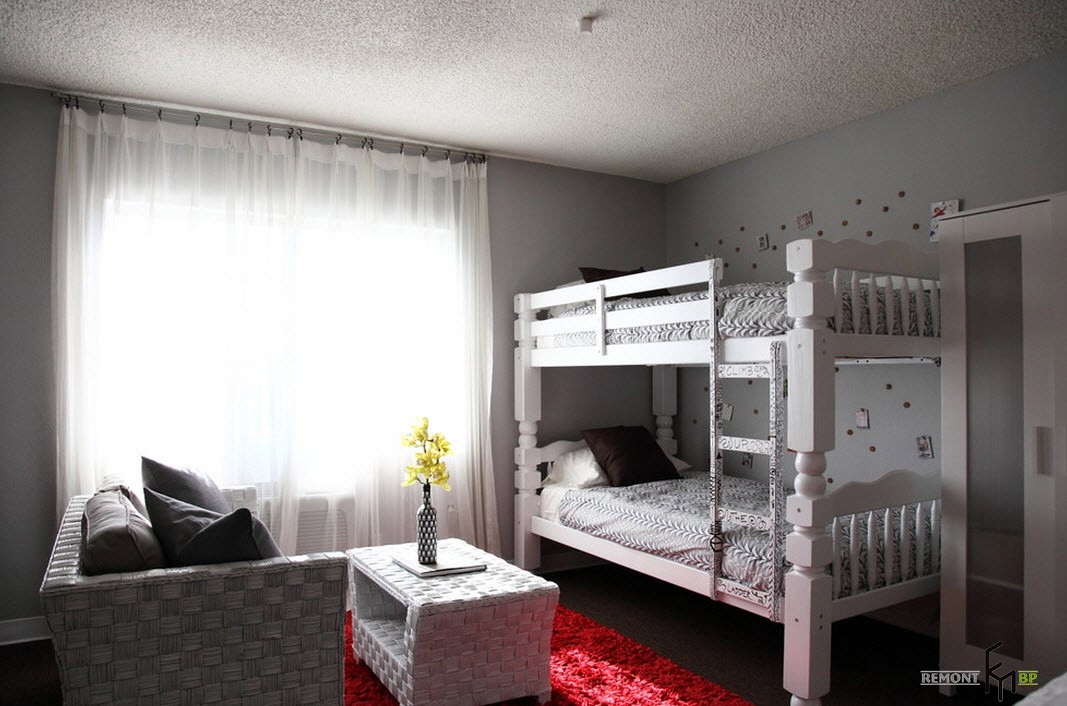 Комната в серых тонах для двоих юных владельцев. Двухъярусная деревянная кровать обеспечивает максимальный комфорт для отдыха. Белые полупрозрачные шторы от пола до потолка смягчают интенсивность светового потока из окна. С таким оформлением интерьера любой хроматический цвет будет подходить идеально. В данном случае для создания цветового акцента комнаты выбран ярко-красный напольный ковёр.