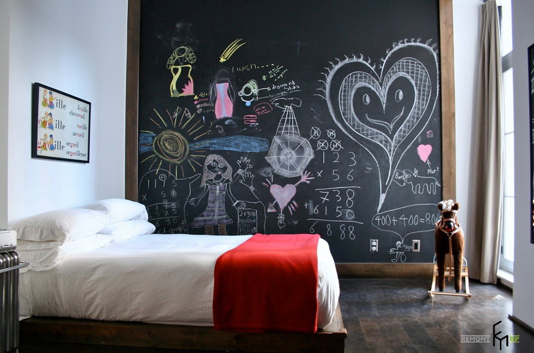 Комната для юной леди с творческими наклонностями. Чёрная доска практически во всю стену даёт возможность наглядно зафиксировать возникшую идею. Красное покрывало – идеально сочетается (если доверится мнению Шекспира – «О совершенство алого на белом!») с белоснежным постельным бельём.