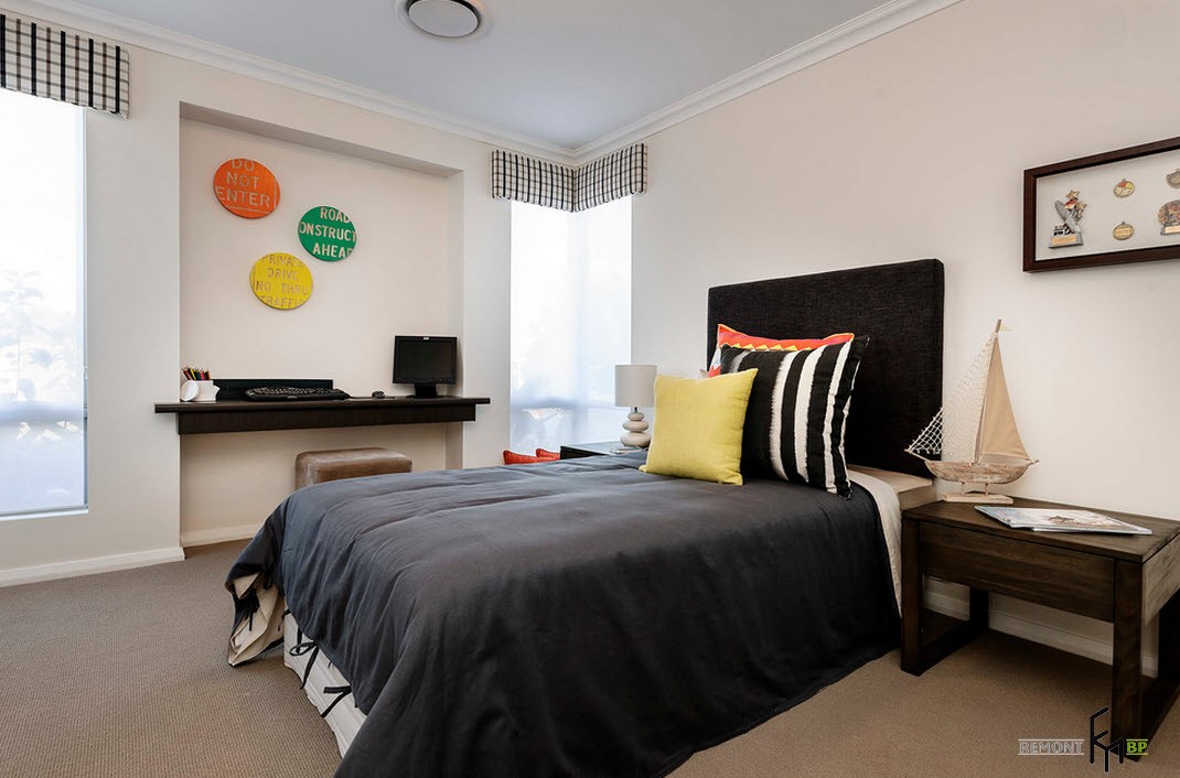В комнате для подростка мебель и изделия из текстиля выдержаны в чёрном тоне, который формирует единый цветовой ансамбль в условиях доминирующих светлых оттенков. Элементы настенного декора перекликаются с цветными вкраплениями чехлов для подушек. Деревянные предметы обстановки, настенная рама и бежевое покрытие пола также сочетаются между собой.