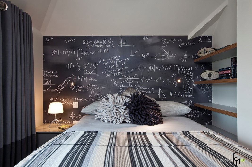 Комната для старшего подросткового возраста. Аскетичную чёткость чёрно-белых геометрических форм подчёркивает декорирование стены в виде доски, исписанной формулами. И только огромные пушистые декоративные помпоны смягчают строгость интерьера, внося в него ноту гуманизма.