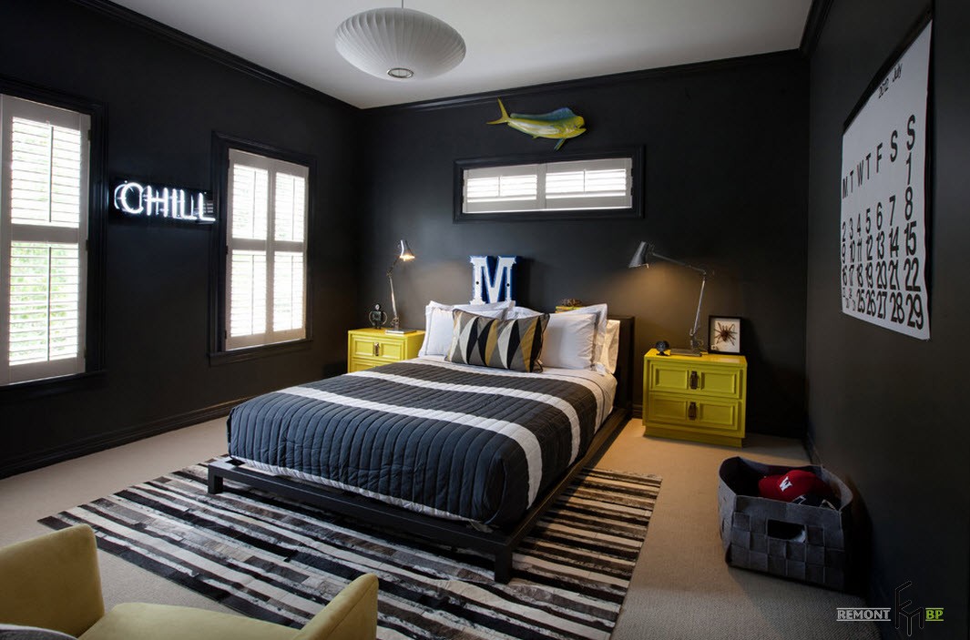 Интерьер комнаты морской тематики для мальчика. Чёрный и белый цвета не только уравновешивают, но и дополняют друг друга функционально. Чёрные стены, белый потолок, светлое напольное покрытие делают комнату визуально более высокой, поступающий из окон естественный свет – более ярким и интенсивным. Большую роль в уравновешивании контрастных пропорций играют детали – система освещения (потолочная люстра с белым плафоном, декоративная светодиодная подсветка на стене, настольные лампы), текстиль (светлое постельное бельё, полосатое покрывало), аксессуары (ковёр с полосатым принтом, большой настенный календарь). Яркие цветовые акценты (желтая мебель, элементы декора) делают комнату тёплой и уютной. Оформление комнаты посвящено морской теме, выраженной лаконичными деталями – рисунок на подушке, краб в застеклённом футляре, изображение рыбы над узким окном, часы в виде приборов из капитанской рубки и большой декоративной буквы М. Никто не усомнится, что комната, в которой нет ничего лишнего и царит идеальный порядок, принадлежит будущему покорителю морских просторов.