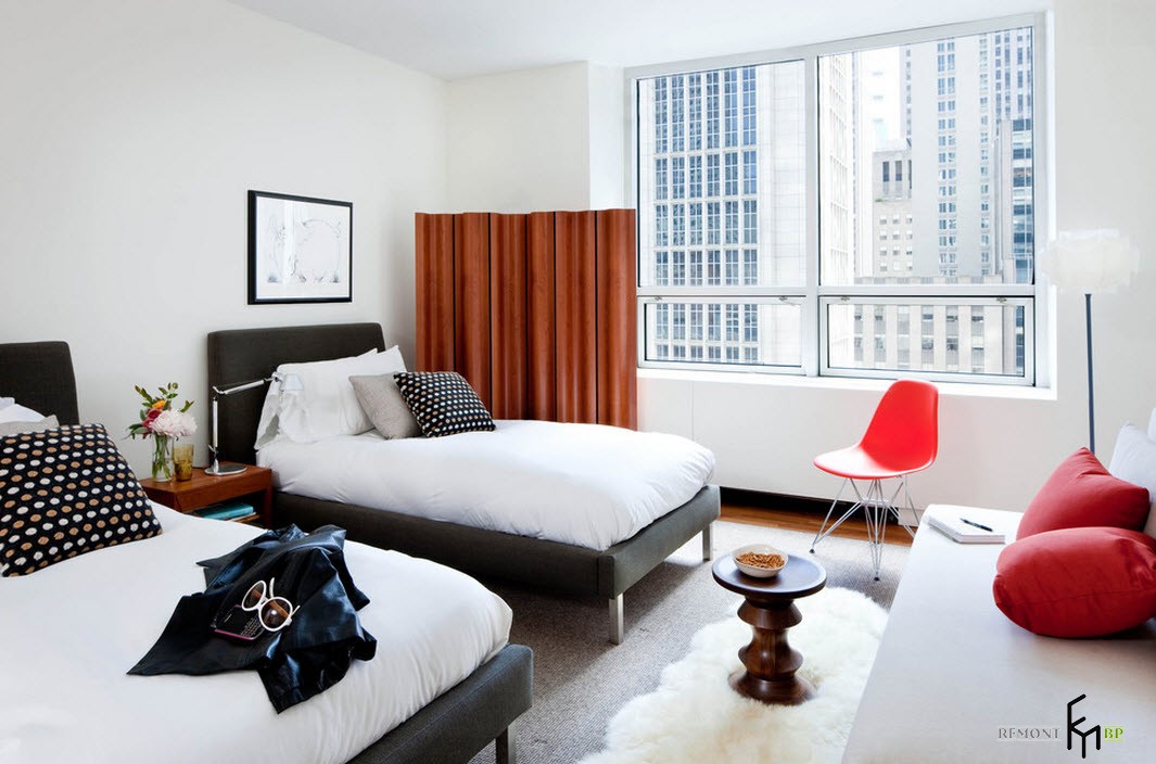 Для двух юных леди, делящих небольшую комнату на двоих, идеальным представляется выбор стиля минимализм с характерными для него доминирующим белым цветом отделки, чёрной мебелью, лаконичного декора и яркого фокуса. В этой комнате применено несколько цветовых акцентов – коричневый экран, позволяющий при необходимости разграничивать пространство; яркие чехлы подушек и алый имсоновский стул из формованного пластика.