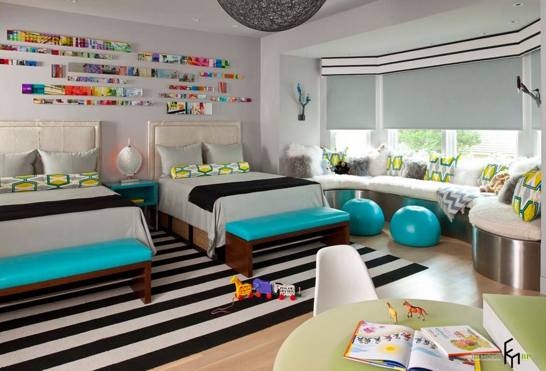 Комната для близнецов, которых принято одевать, снаряжать и одаривать одинаково. При оформлении комнаты используются те же принципы “одинаковости”. Одинаковые кроватки, сиденья, общие диван и стол. Напольный ковёр с чёрно-белыми полосами перекликается с элементами отделки стен, окон и аксессуарами. использование бирюзового, жёлтого и оранжевого делают интерьер очень праздничным и жизнерадостным.