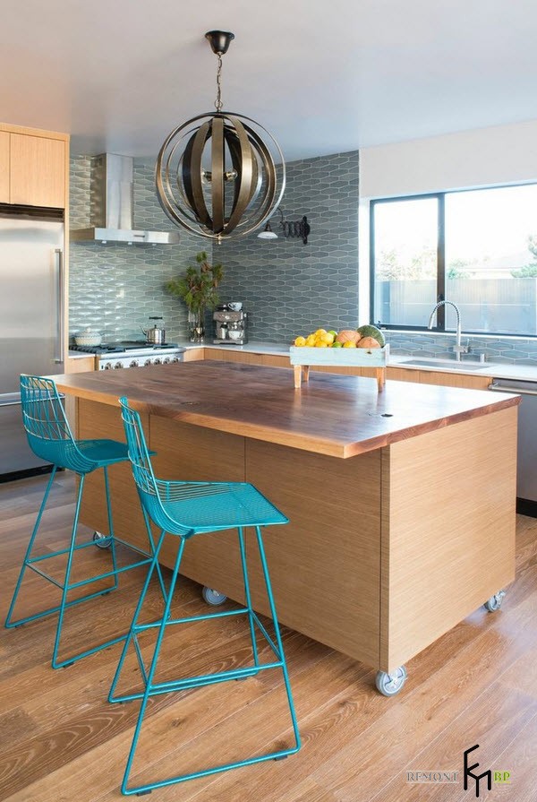Оригинальные акценты на фоне светлого интерьера: необычная форма люстры в стиле хай-тек и ярко бирюзовые стулья подчеркивают художественную направленность стиля: