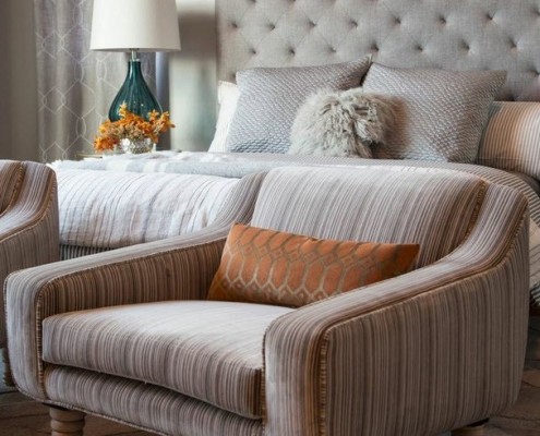 В спальне достаточно разместить большую удобную кровать, туалетный столик и комод. Главное в выборе мебельных предметов избегать острых угловатостей и прямолинейности.