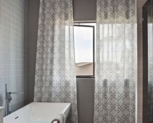 Определенных требований к цветовой гамме ванных комнат в модерне нет. Здесь допустимы и яркие краски, и бледные пастельные тона. Поскольку в нашем примере дизайн всего дома, включая ландшафт, в целом выдержаны в приглушенных оттенках, то и цветовая палитра ванной и туалета не выделяется из общего колорита особняка:
