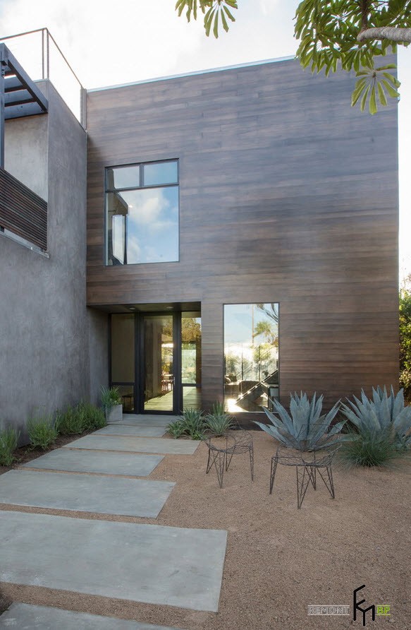 Придомовая территория должна полностью отображать основную стилистическую идею. Модернизм предполагает натуральные материалы, большое пространство, которое подчеркнуто дугообразными линиями с зеленью и красивым освещением.