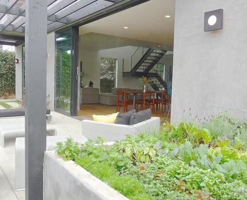 В оформлении патио присутствуют четкие линии и натуральные материалы. В нем размещается удобный стол с креслами из лозы или кованого металла, дополненные мягкими однотонными подушками.