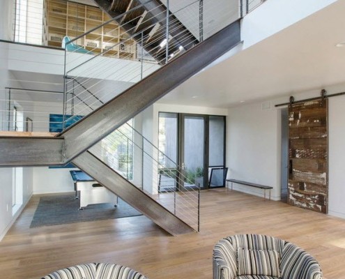 Поскольку модерн отличается высокой прагматичностью, то оптимален он будет в квартирах-студиях и совмещенных комнатах. Например, прихожая, совмещенная с холлом. Здесь главная задача – сохранить максимум свободного пространства и света. Для этого используются светлые напольные покрытия из массива дерева, панорамные окна и двери. Лестницы отличаются изяществом формы и не загромождают интерьер: