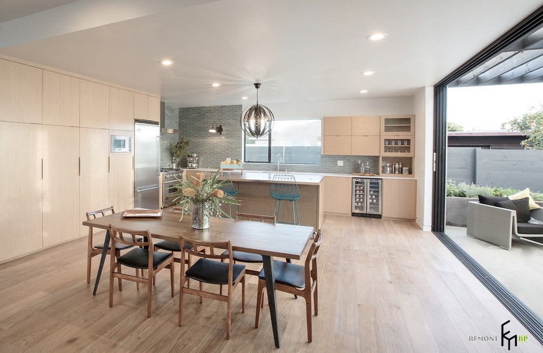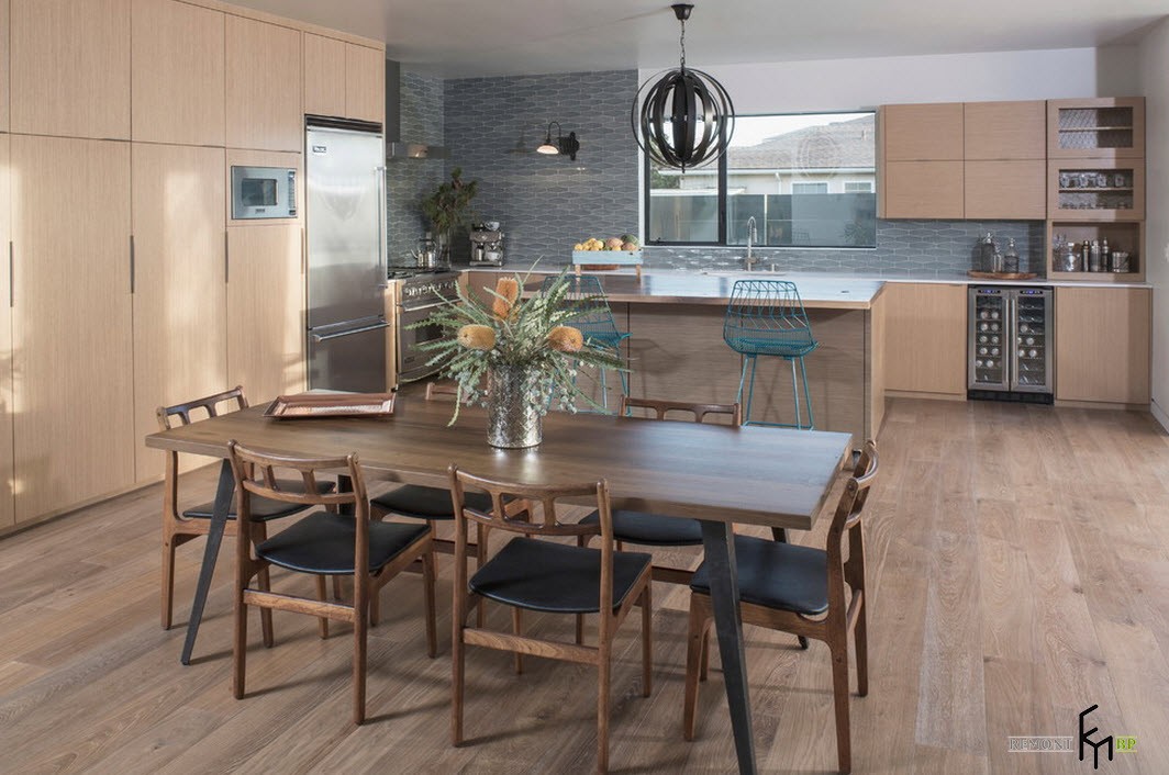 Отделочные материалы используются современные технологичные в сочетании с натуральными. Это может быть зеркальная или глянцевая поверхность в рабочей зоне и деревянная в зоне столовой. Холодность блестящего серого цвета компенсируется теплом оттенков натуральной древесины: