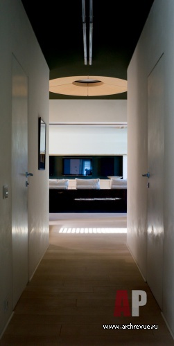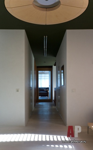 Вид из коридора на гостиную. Круглый светильник выполнен из дерева по эскизам архитекторов.
