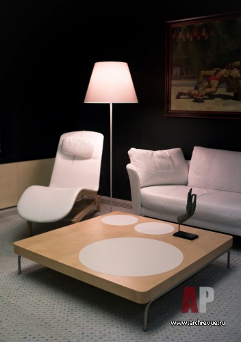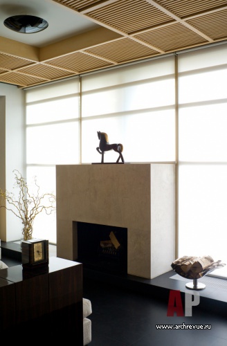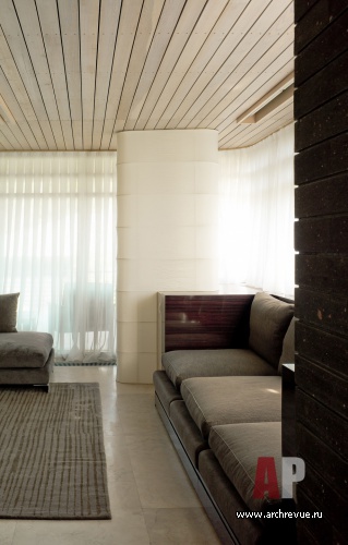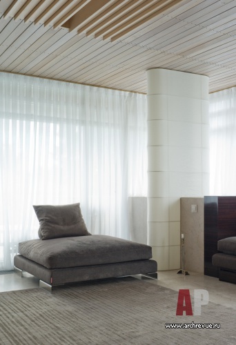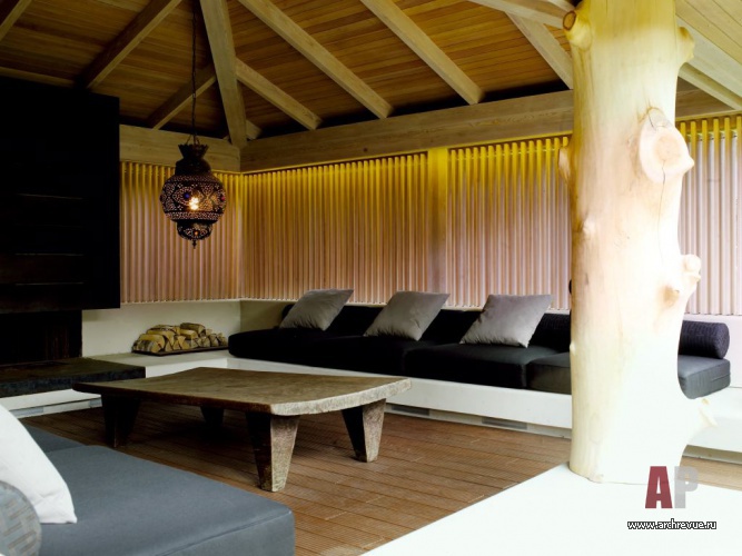 Каминный зал. Диван Flexform. Полоток зашит панелями из лиственницы, изготовление Tudor. Светильник выполнен на заказ по эскизам архитекторов.