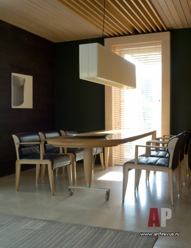 Столовая группа интегрирована в пространство гостиной. Стол и стулья Giorgetti. Потолок и окно оформлены панелями из клена.