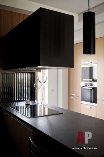 Композиционный центр кухни – рабочая зона. Столешница из гранита. На фасадах – выбеленный дуб.