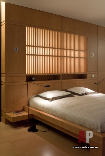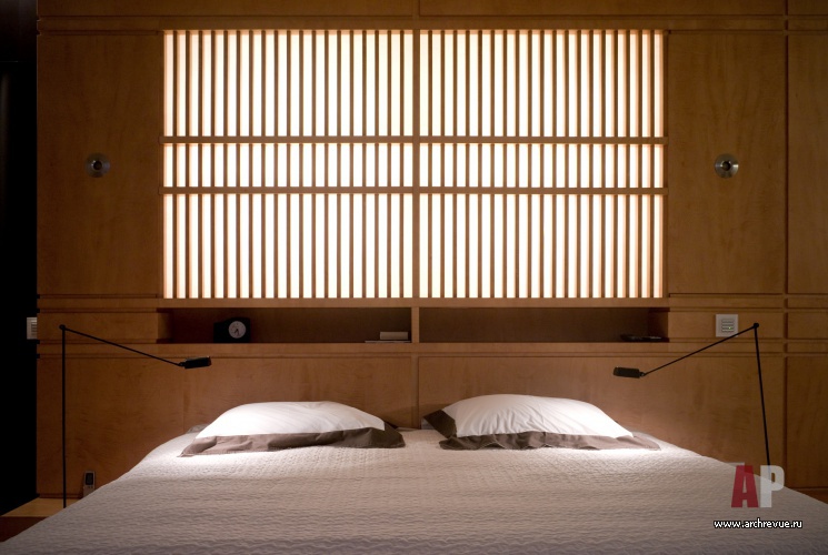 Вся мебель в спальне сделана по эскизу архитекторов. Стены облицованы кленовым панелями Sherle Wagner. Пол кожаный.