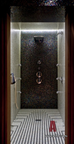 Душевая кабина с гидромассажем при банном комплексе в цокольном этаже.