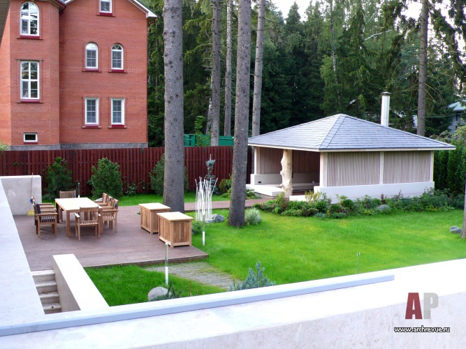 С помощью палубного настила дом соединяется с открытой верандой и беседкой.