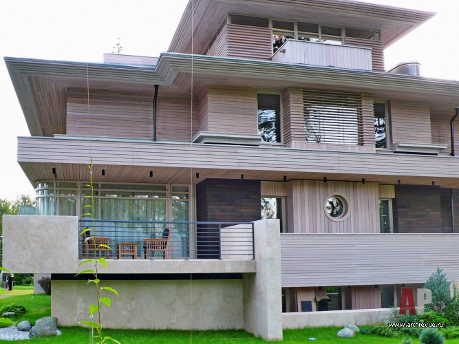 Главный фасад дома отделан беленой лиственницей и редким черным туфом, специально привезенным из Армении.